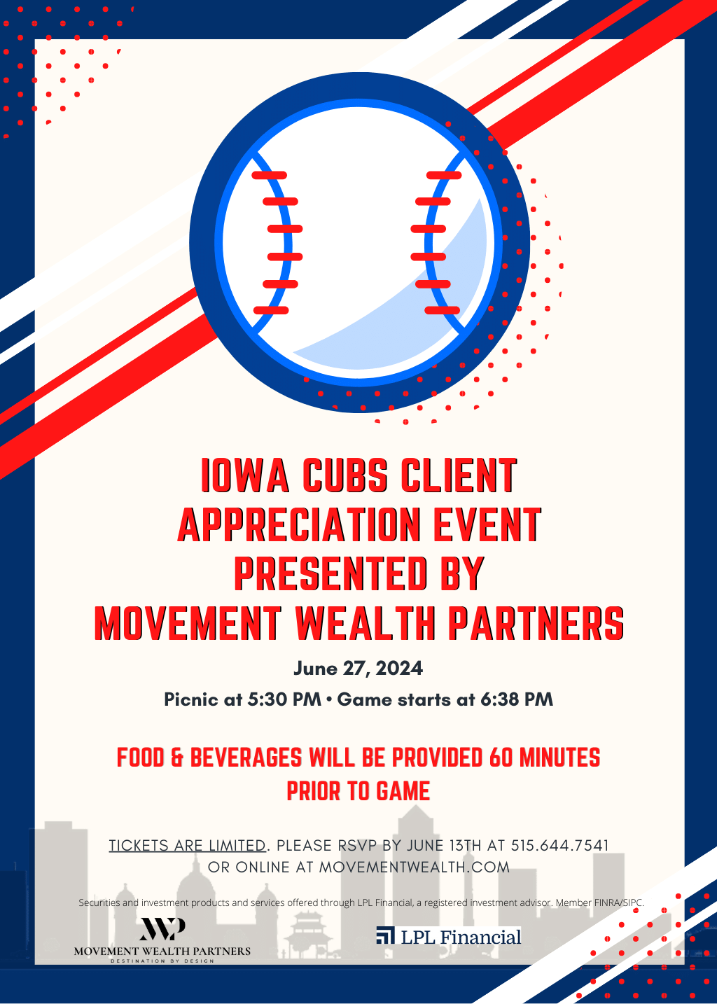 Come join us as we at Movement Wealth Partners celebrate YOU, our clients, at our Iowa Cubs Client Appreciation Event. The Saint Paul Saints will meet our Iowa Cubs on Thursday June 27, 2024 at Principal Park in Des Moines. The first pitch will be at 6:38pm, but the doors will open an hour prior for food and beverages. Tickets are limited and are on a first-come/first-served basis. Registration ends Thursday June 13th.